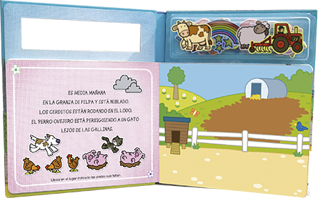 Ficha técnica: 10 páginas de 19,5 x 17 cm. Tapa cartoné con blíster plástico. Incluye 20 piezas adhesivas de felpa.