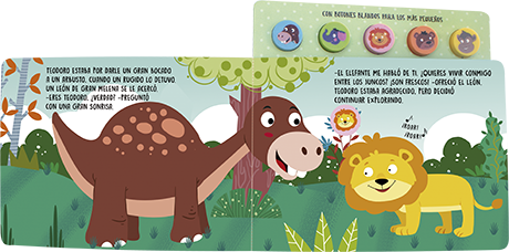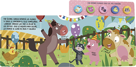 Ficha técnica: 12 páginas de cartón de 23,5 x 23 cm. Tapa de cartón. Puntas redondeadas. Incluye botonera de silicona con sonidos. Incluye baterías.