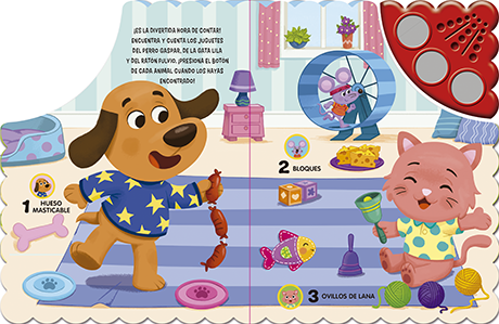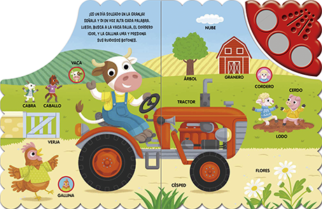 Ficha técnica: 8 páginas de cartón de 20 x 26 cm. Tapa de cartón troquelada con botonera de sonidos.