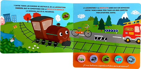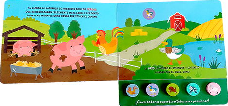 Ficha técnica: 12 páginas de cartón de 23,5 x 23 cm. Tapa de cartón. Puntas redondeadas. Incluye botonera de silicona con sonidos. Incluye baterías.