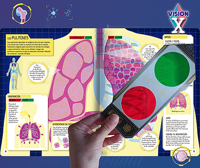 Ficha técnica: 24 páginas de 29 x 22 cm. Tapa de cartone troquelada laminada mate. Contiene lentes especiales de Visión X.