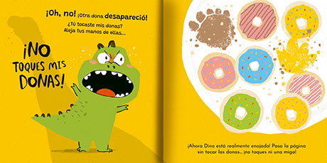 Dino ama las donas, pero no le gusta mucho compartir. Pasa con cuidado cada página para no hacerlo enfadar.